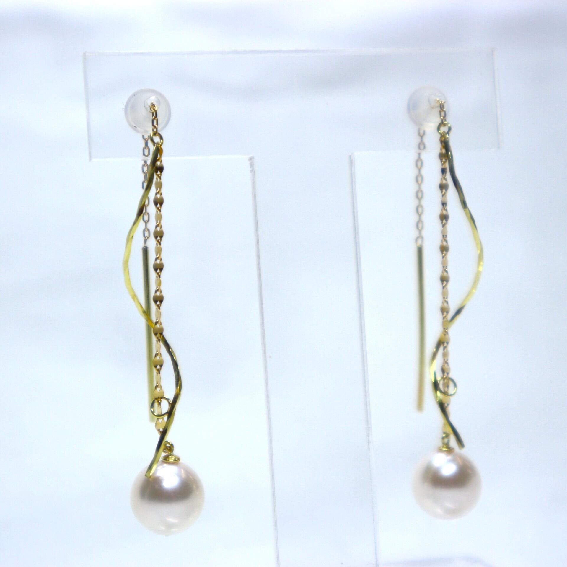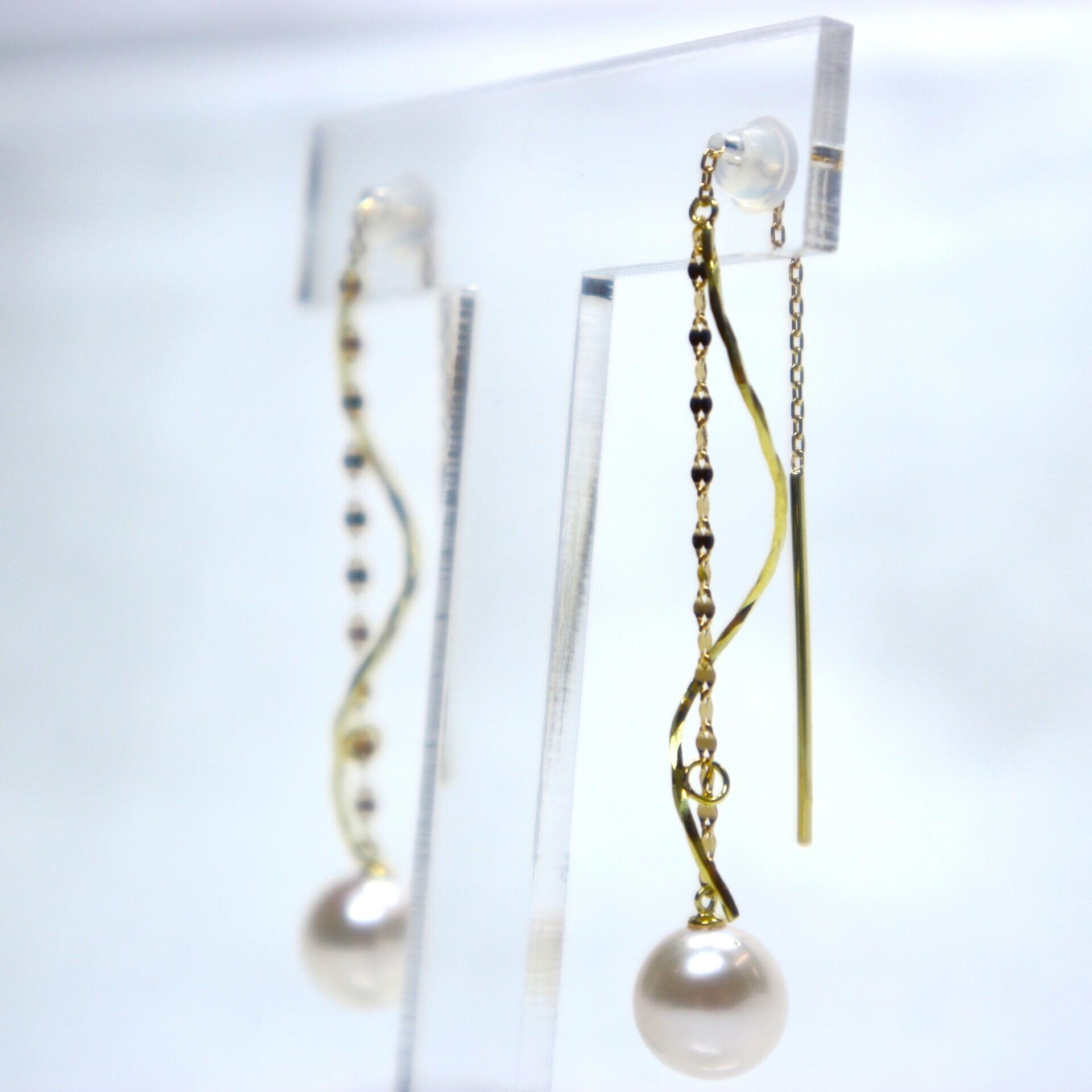 優しい色みのアコヤ真珠に光を反射しキラキラ輝くK18ゴールドの曲線とチェーンを合わせて、