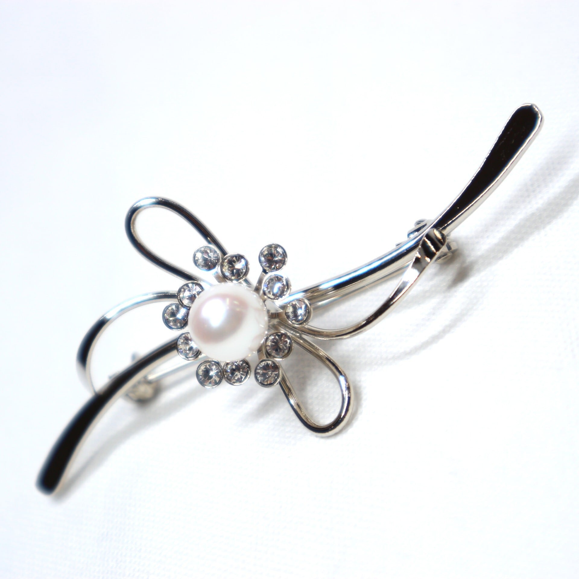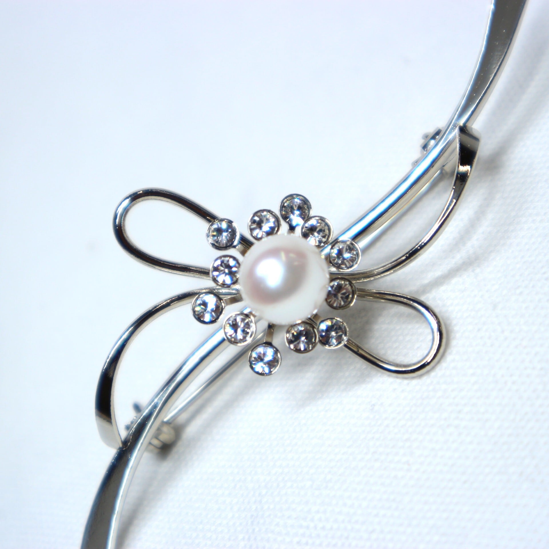 流れるような曲線のリボンが立体感を出し、中央部分にアコヤ真珠とキュービックジルコニアを施しているのでキラリと輝くのが魅力。