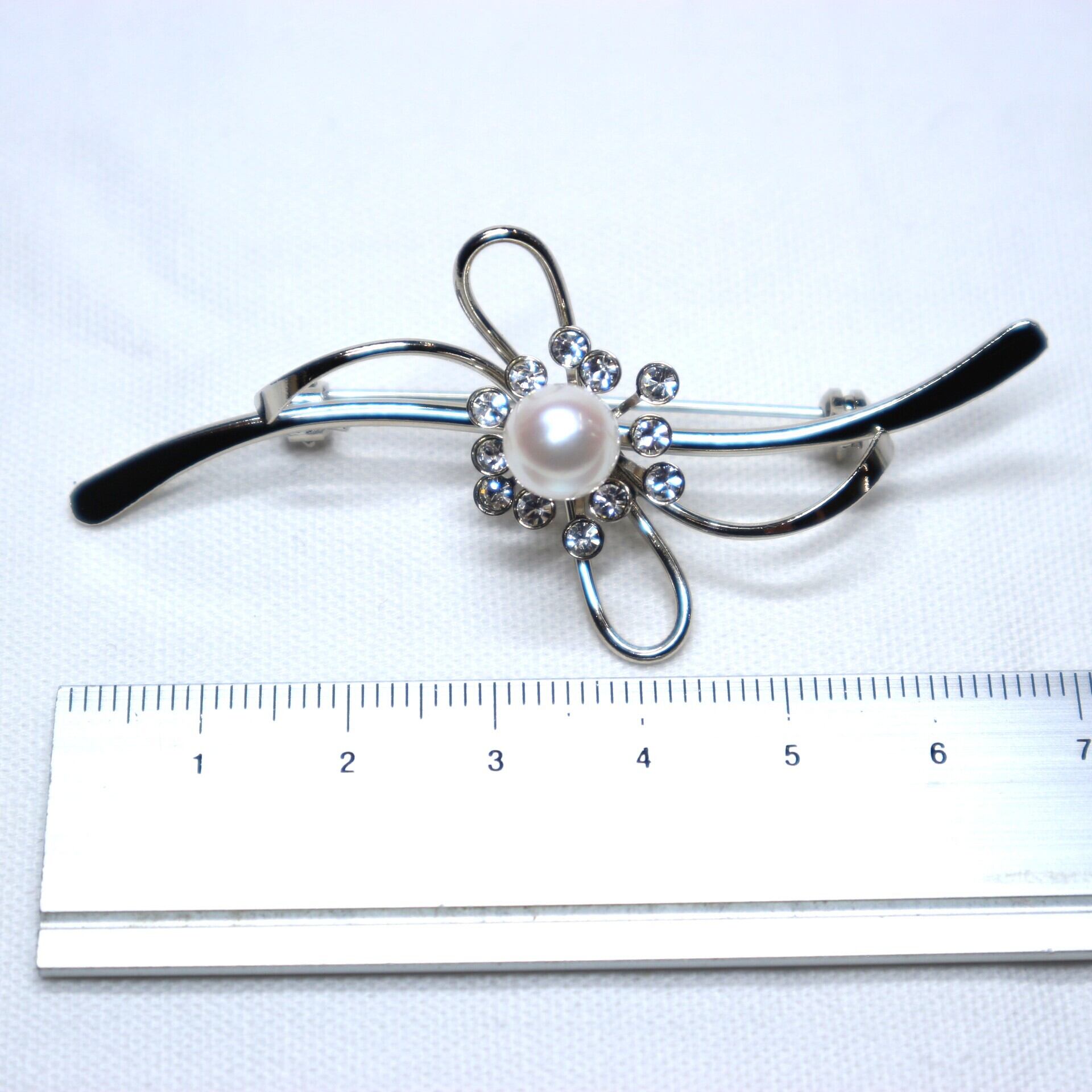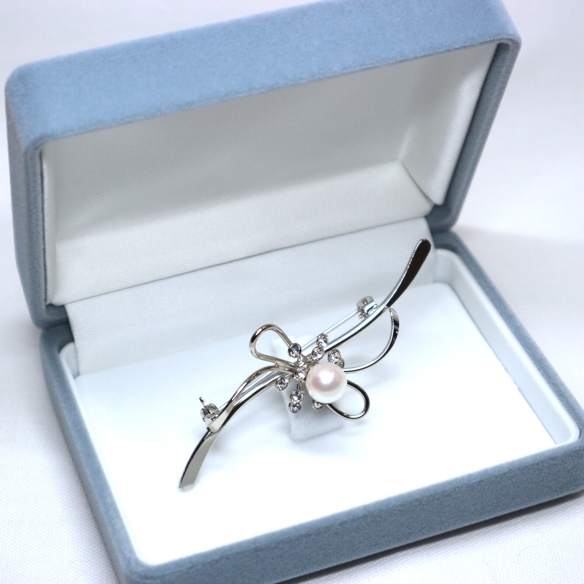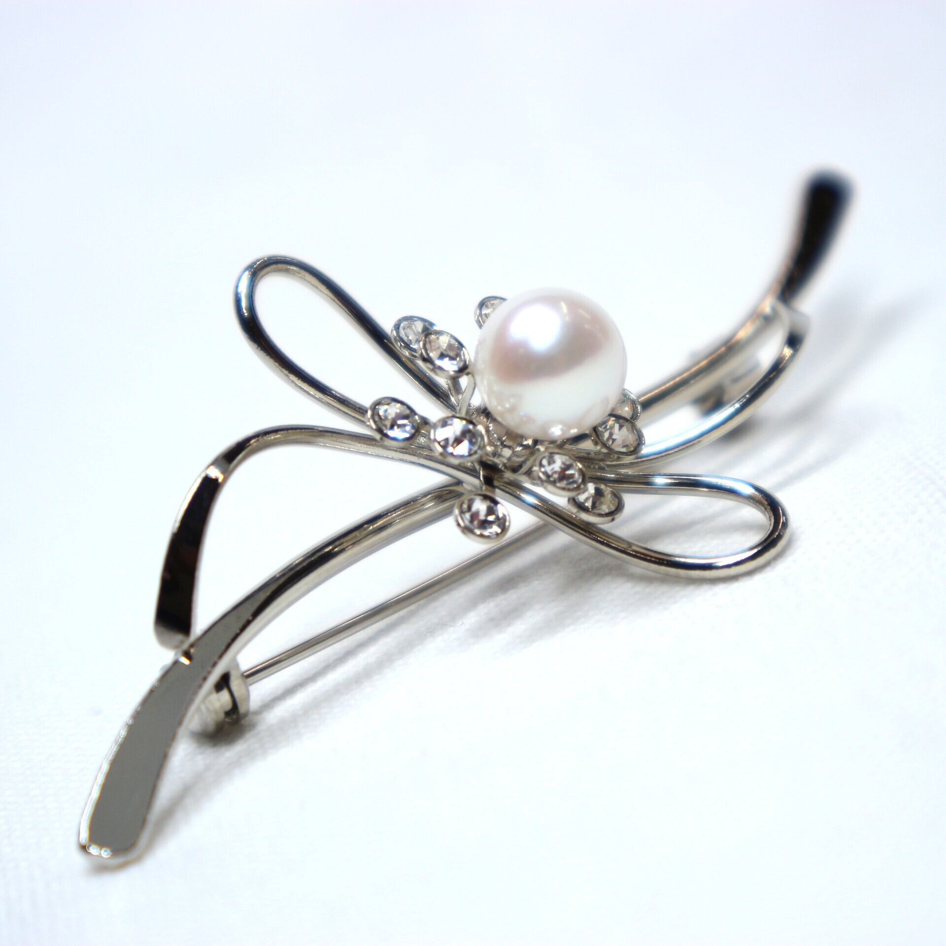 流れるようなリボンモチーフのブローチ。中央にやさしい色を放つアコヤ真珠とジルコニアを施しました。ワンポイントアクセントとして使用しやすいサイズ感です。