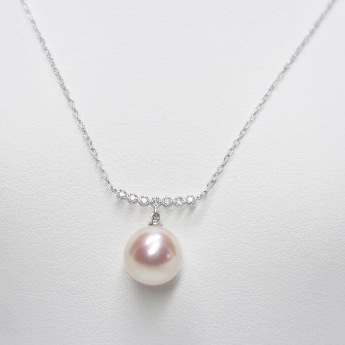 強いピンク色の発色と光沢を持つ9.0mmのパールを、K18ホワイトゴールドとダイヤモンドの強い輝きを持つヘッドとチェーンを合わせました。