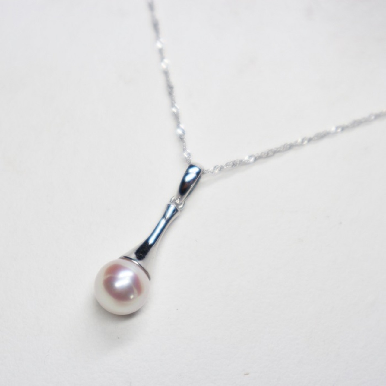 強いピンク色の発色と光沢を持つ7.0mmのパールと縦長のK18ホワイトゴールドヘッドが首元をすっきりと演出してくれる一品です。