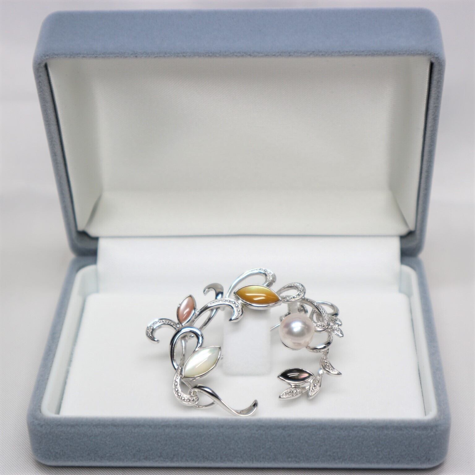8.5mmアップの深みのある干渉色を纏い輝くアコヤ真珠と4色のシェルがアクセントになったデザインブローチ。ペンダントとしての使用も可能です。