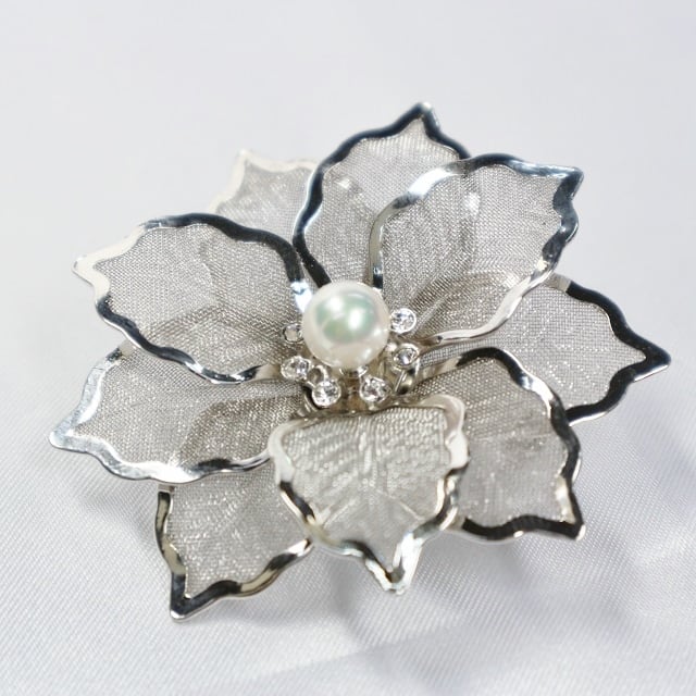 光沢がよく、やさしい色を放つアコヤ真珠を、立体感あるお花の中央に!ジャケットの襟に着けていただくと、パッとゴージャスになるコサージュ代わりになるブローチです。