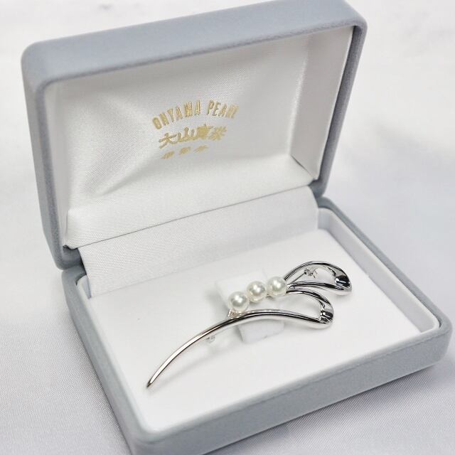 スッキリとしたラインフォルムのブローチに照りの良いあこや真珠を3つ並べました!