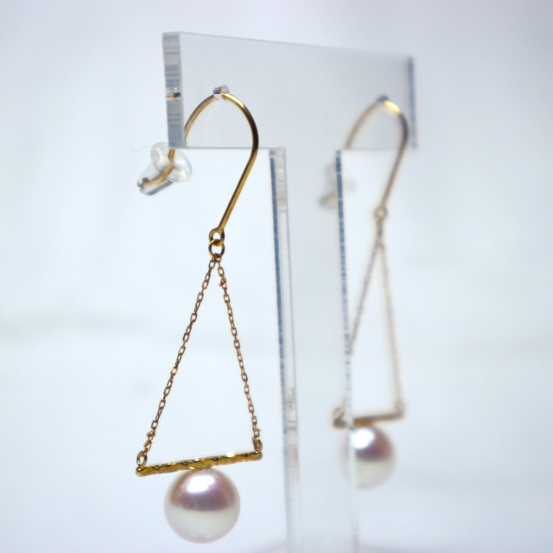 強い輝きと鮮やかなピンクの発色をもつアコヤ真珠(8.0mm珠)をセッティングし、動くたび揺れるデザインピアスに仕上げました。
